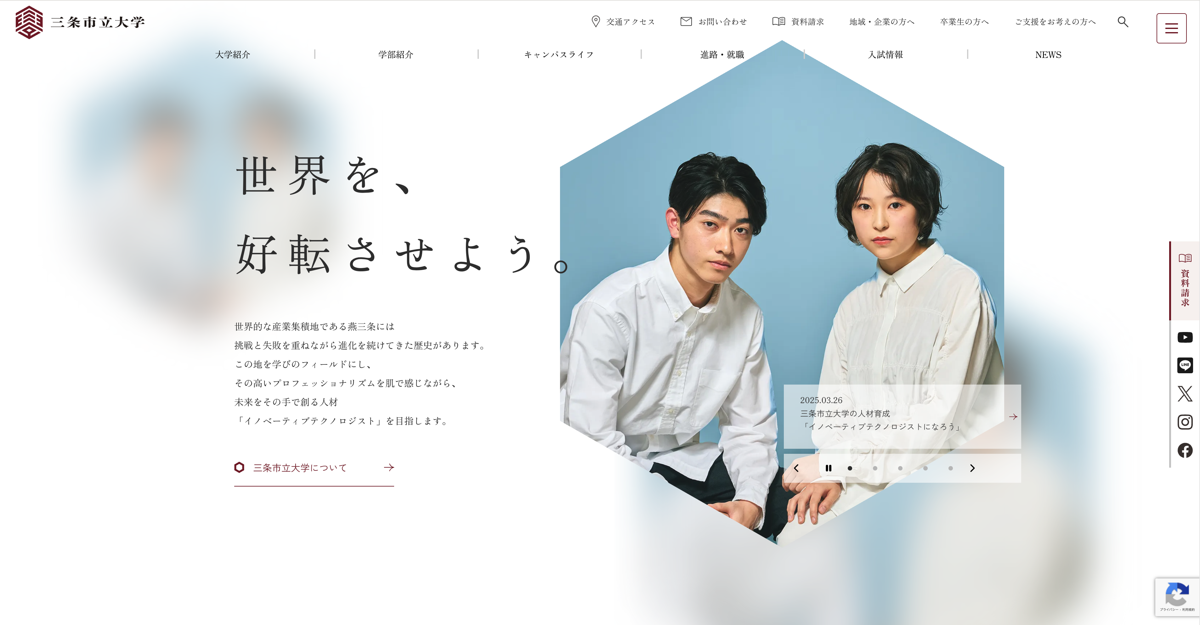 長谷川さん: Webサイトは、主に高校生やその保護者、教育関係者の方々が訪れる重要な接点です。そのため、情報の見つけやすさはもちろんですが、本学の世界観を伝える「ブランディング」を非常に大切にしています。 昨年3月にサイトを大幅にリニューアルした際も、色彩やデザインによる雰囲気作りを徹底しました。単なる情報掲示板ではなく、本学が立地する燕三条が持つ洗練された空気感を視覚的に感じてもらえるような構成を意識しています。